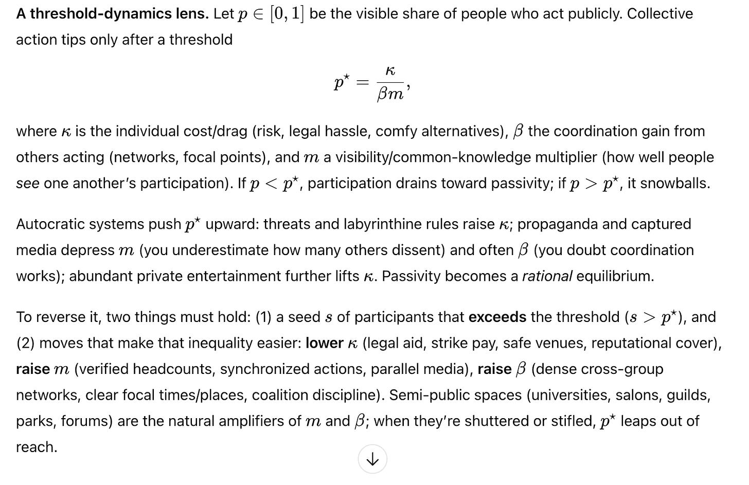 I think Timothy Snyder is quite wrong when he suggests you just “build a private life” against tyranny — even if his counsel has value against surveillance, as a strategy for change it raises p⋆. According to the rules of threshold dynamics, the more you feel restricted by a system and want it to change, the more pressure, effort, and masses you should be producing to counter it. Getting out of the way just seems like a terrible idea that will obviously leave you with the exact opposite result to what you want. As we discussed in my first essay, your rights and equality as a participant in a society come with the duty to fight any form of collective gaslighting that wants you to think your rights and equality don’t come with this duty.