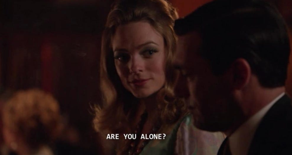 Weiner even said in an interview, when answering viewer questions about some professional subterfuge or marital infidelity undertaken by Draper: “He likes strangers.” Wiener doesn’t say: Don prefers strangers [to those he already knows], but I think that’s what he means. Obviously, preferring strangers to the people one is deeply connected to and loves is pathological: only engaging with new people ensures no one ever gets to know you, ever gets to see the real you, and that you never have to deal with whatever you’re trying to escape from. To new people it is so easy to lie, to act. People who only have superficial friendships have no friends. People who sleep around for “variety” really only sleep with the same person over and over again. They only see the beginning which is always low context and thus always the same — no wonder they burn out.